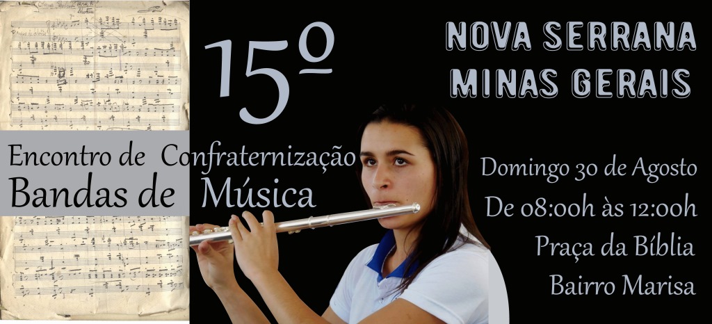 Venham participar do 15º Encontro de Confraternização de Bandas, que será realizado no dia 30 de agosto de 2015, na Praça da Bíblia – Bairro Marisa – Nova Serrana-MG.